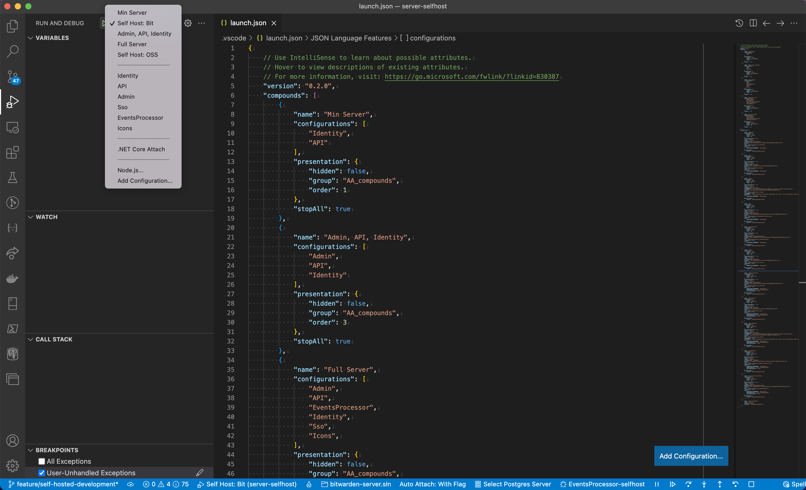 We have a number of launch configurations as well as combined configurations to make launching the services easy. By default, the individual self-host launches are hidden. Navigate to launch.json to un-hide them.